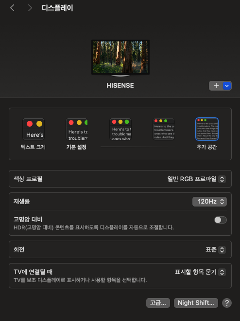 해당 티비는 120hz 주사율일 때 가독성이 뚜렷해서, 우선 120hz로 사용하고 있어요!